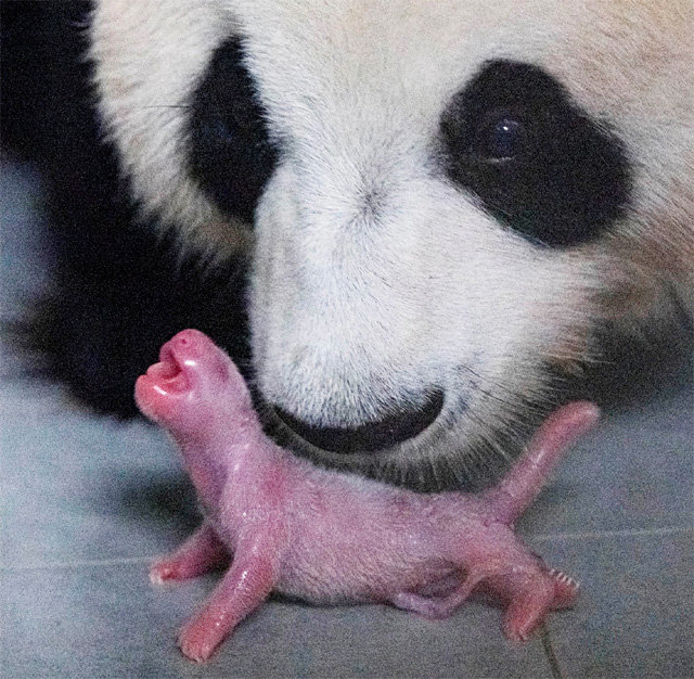 赤ちゃんパンダはピンク色でとっても小さいんだよ~…おしてみて!→ 赤ちゃんパンダ
